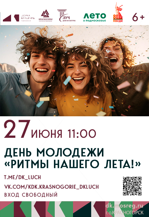 Лето – время ярких эмоций, новых друзей, новых знакомств и незабываемых приключений! Дом культуры «Луч» готовит настоящий праздник в честь Дня молодёжи – день, наполненный энергией, творчеством и драйвом! В программе: БУМАЖНАЯ ДИСКОТЕКА – море конфетти, весёлая музыка и зажигательные танцы! Конкурсы и флешмобы – покажите свою ловкость и креативность! Не забудьте взять с собой хорошее настроение и удобную обувь – будет жарко! Приводите друзей и давайте вместе сделаем это лето по-настоящему ярким!