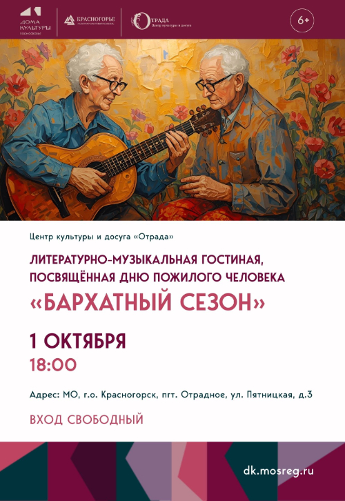Литературно-музыкальная гостиная «Бархатный сезон», посвящённая Дню пожилого человека, подарит тёплую атмосферу душевного общения и искренней благодарности старшему поколению. В программе — слова признательности, выступление хора русской песни «Россияночки», а также яркое музыкальное сопровождение от брасс-ансамбля «Маэстро-Бэнд».