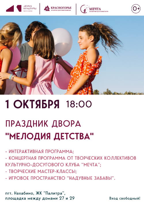🎊🎈 Клуб «Мечта» с радостью объявляет о Празднике двора «Мелодия детства»! 📅 Дата: 1 октября 2025 г. в 18:00 📍 Адрес: МО, г.о. Красногорск, пгт. Нахабино, ЖК «Палитра» (площадка между домами 27 и 29). Приглашаем всех жителей и гостей на интересное событие, которое подарит яркие моменты радости и веселья! В программе нашего праздника: 🌟 Интерактивная программа с аниматорами; 🎶 Концертная программа от талантливых коллективов Культурно-досугового клуба «Мечта»; 🎨 Творческие мастер-классы; 🕺 Игровое пространство «Надувные забавы»; 😊 И, конечно же, отличное настроение! Этот праздник станет прекрасной возможностью провести время в кругу соседей и друзей, почувствовать атмосферу единства и радости! Не упустите шанс стать частью этого замечательного события! Мы ждем вас с нетерпением!